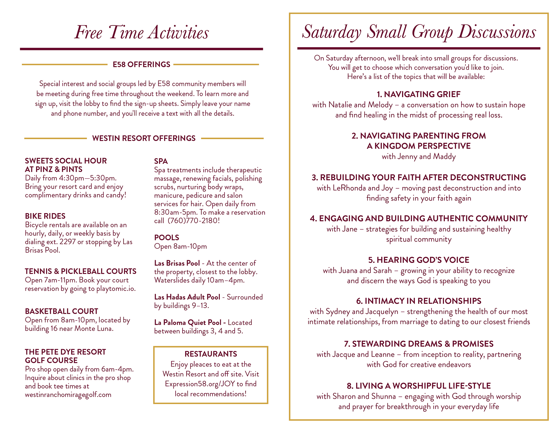 We’ve intentionally built in a large block of leisure time for you all on Saturday in order to really pursue rest. Here is the Resort Activity Guide and Local Restaurants Guide for you to browse as you think about how you want to spend your time. Take a look at the retreat itinerary and plan your leisure time!